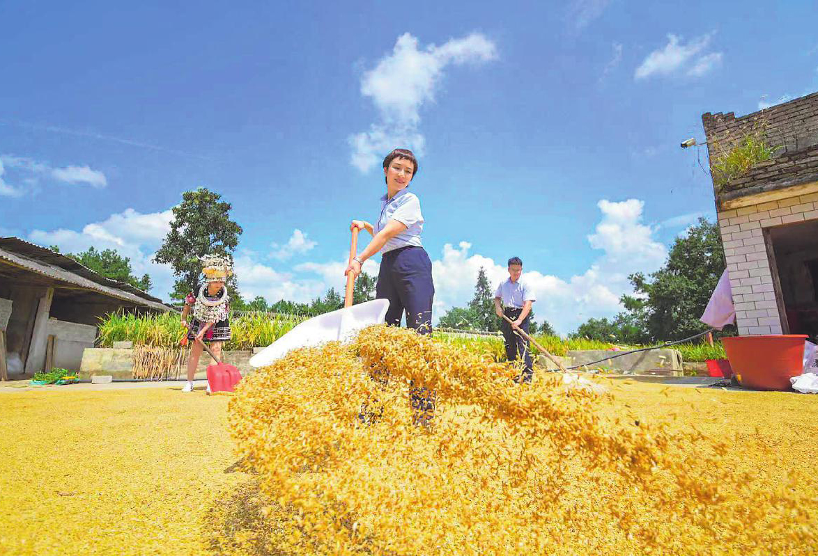 邮储银行贵州省分行党委立足地方实际,深入推动党业融合,充分发挥产品与服务优势,今年以来累计投放超100亿元信贷资金,助力贵州推动乡村振兴战略深入实施和加快构建现代粮食产业体系,实现以金融之力护航地方“盈粮满仓”。图为黔东南苗族侗族自治州分行党员志愿者日前与农户一同晒稻谷,共享“秋收万颗子”的喜悦。