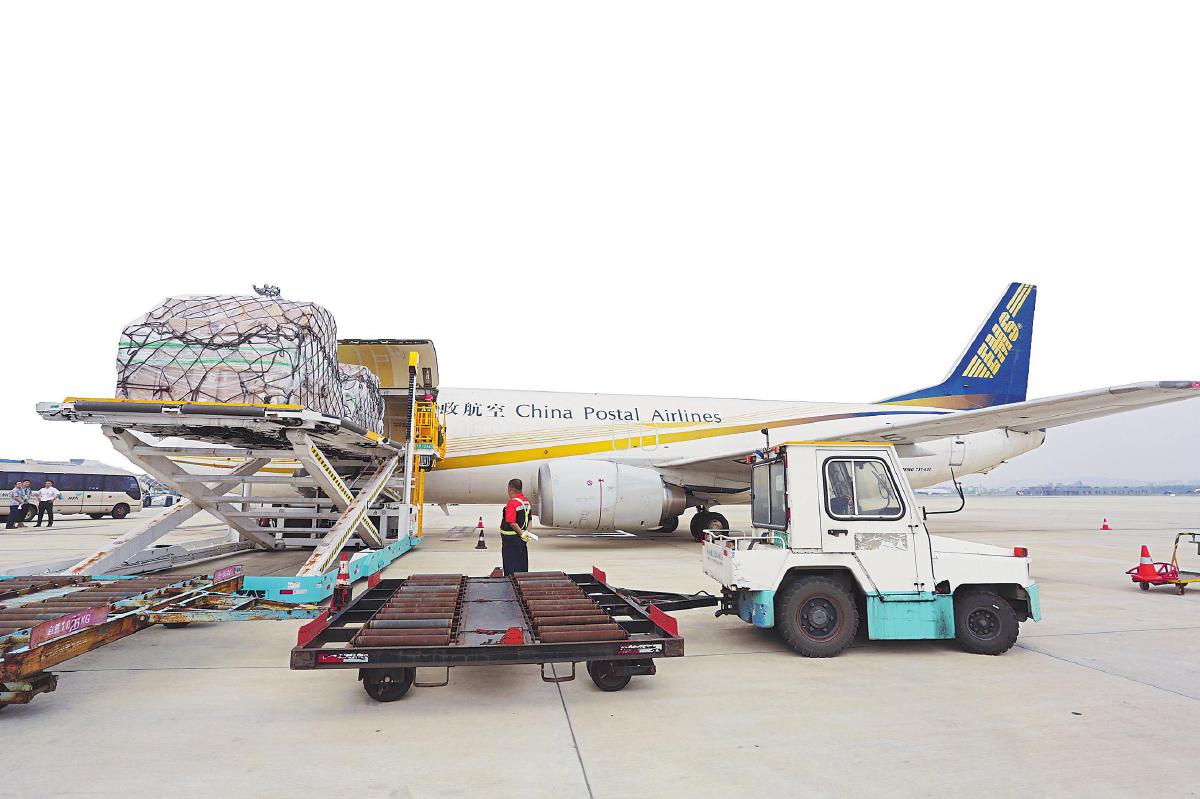 邮航飞机满载中邮集运货物驶向海外。