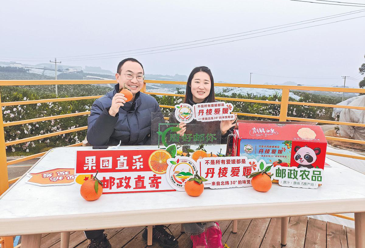 “眉好邮你”团队通过电商直播助销丹棱爱媛橙。 □邹凤 摄