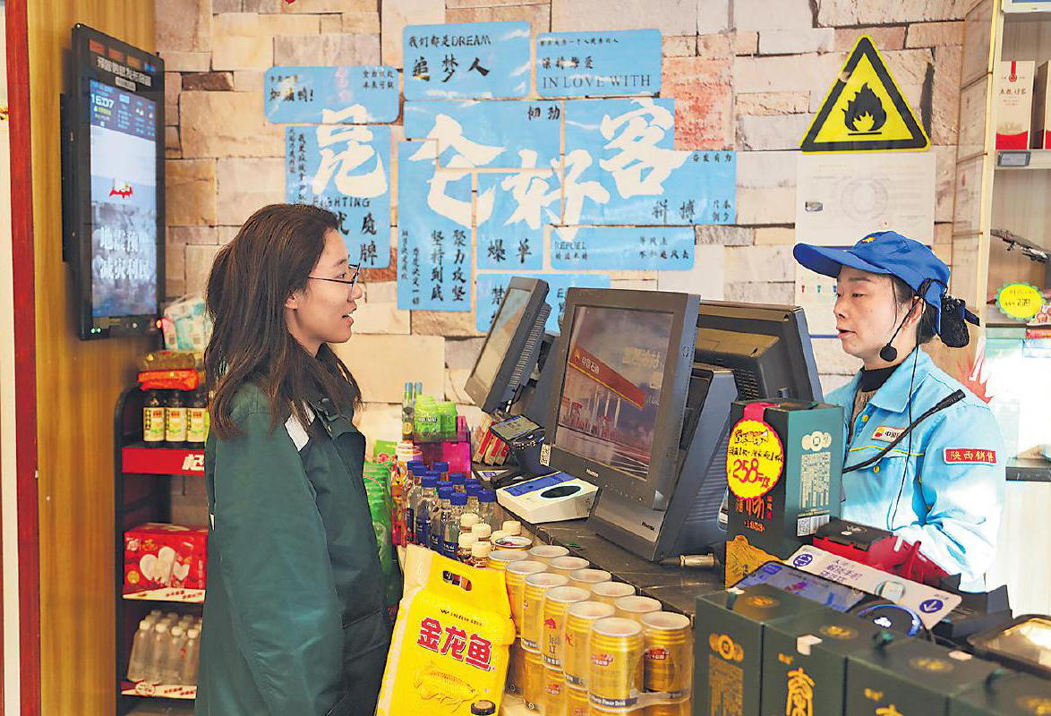 毛婉钰(左)与“昆仑好客”便利店客户交流。