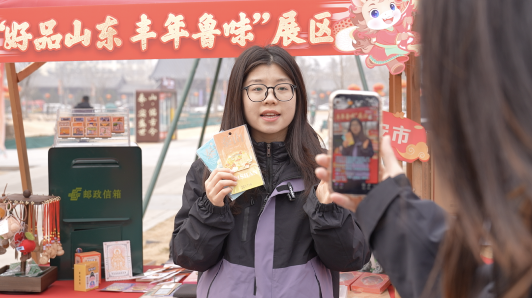 泰山的文脉,不只在线下传承。采访次日,记者跟随泰安邮政直播团队,来到“齐鲁有年味 云端买好品”2026网上年货节的大集现场。“买文创、品年味”,各展位的主播较着劲儿地提升音量。张迪自豪地向记者补充说,依托泰山景区连续三年超800万人次的接待量,加上线上直播的带动,目前主题邮局4家门店日均接待量共计约5000人次,影响力已跨越国界:“法国圣米歇尔山采购了500多套我们融合中法元素的‘双山对话’明信片,放在他们的官方店售卖。”
