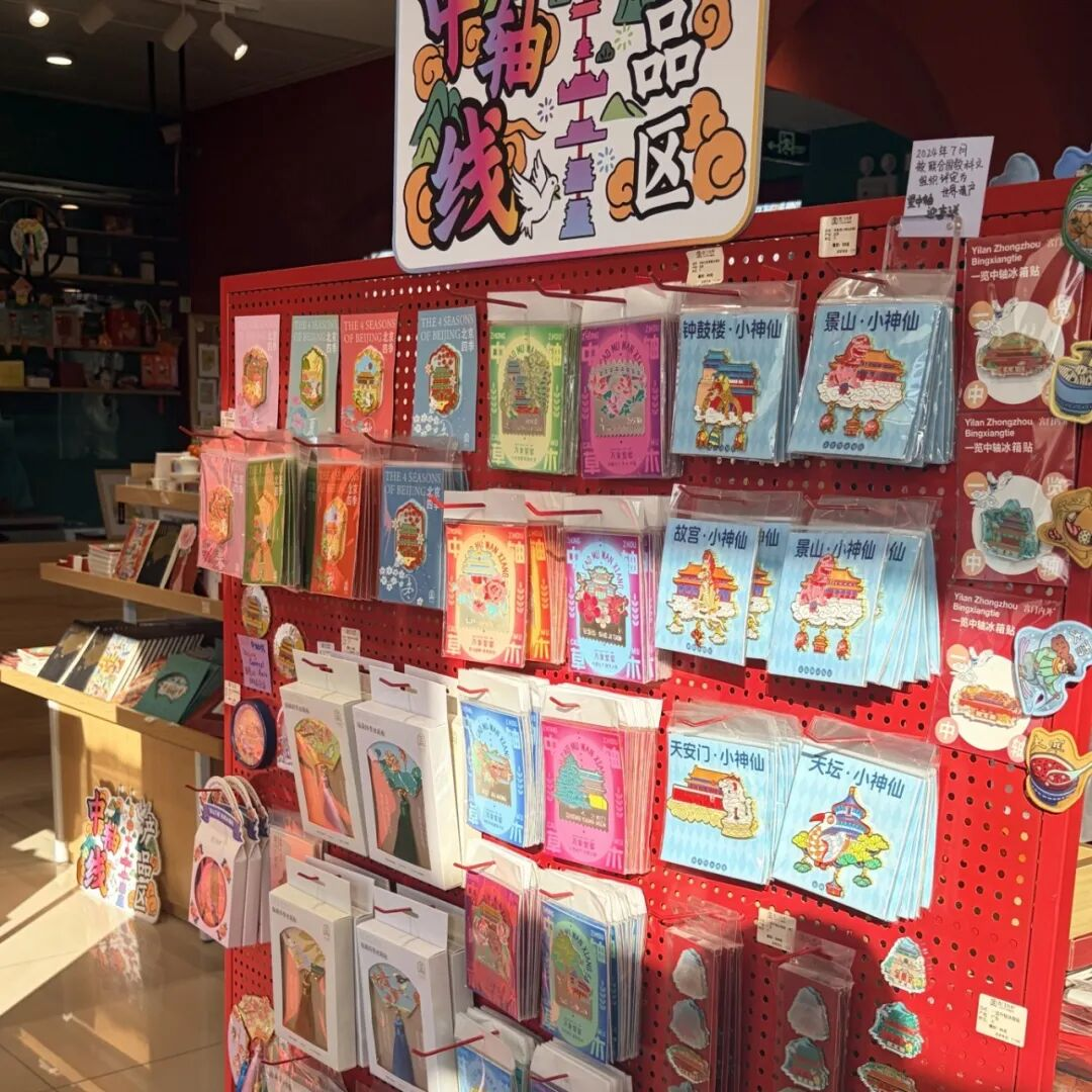 位于中轴线“龙尾之要”的中轴线主题邮局,是这条文化脉络的集中呈现。冰箱贴、挂饰、徽章,每一件都镌刻着钟鼓楼、万宁桥、正阳门的剪影。而最热闹的,则是集章台前排列的长队。