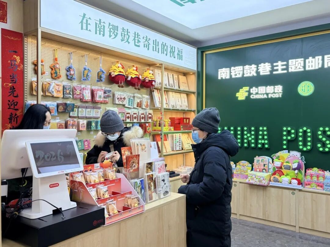踏上斑驳的青石板路,拐进菊儿胡同。四合院的门墩贴着纸糊上的福字,风里裹着糖炒栗子的焦香。顺着“冰糖葫芦——”的悠长吆喝,记者钻进了不久前重装升级的南锣鼓巷主题邮局。午后阳光斜照进来,工作人员正拆封新到的200多枚明信片,为即将到来的客流高峰备战。