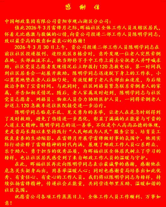 晖福社区居委会在感谢信中写道,陈明学临危不乱、挺身而出,以实际行动守护群众生命安全,他用凡人善举诠释了雷锋精神的时代内涵,展现出邮政人心系群众、乐于助人、勇于担当的良好风貌。