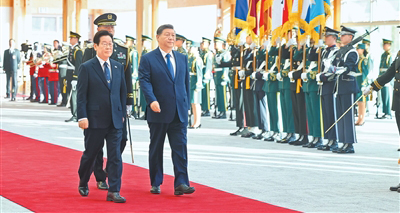 习近平同李在明登上检阅台。军乐团奏中韩两国国歌。习近平在李在明陪同下检阅仪仗队。两国元首分别同对方陪同人员握手致意。