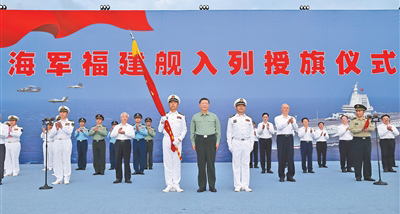 我国第一艘电磁弹射型航空母舰福建舰入列授旗仪式5日在海南三亚某军港举行。中共中央总书记、国家主席、中央军委主席习近平出席入列授旗仪式并登舰视察。